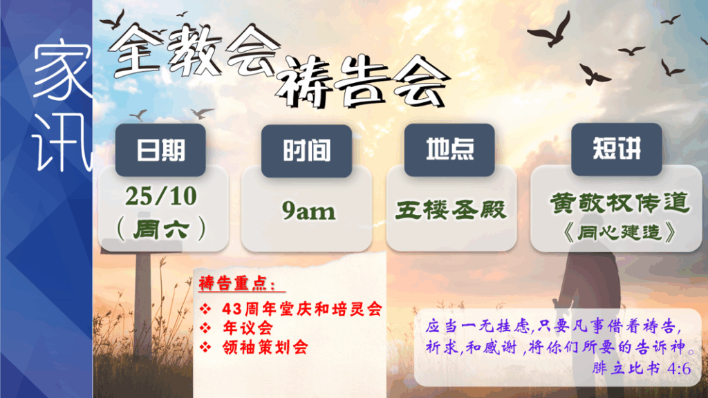 欢迎大家一起出席,彼此同心为着教会的事工一同代祷。