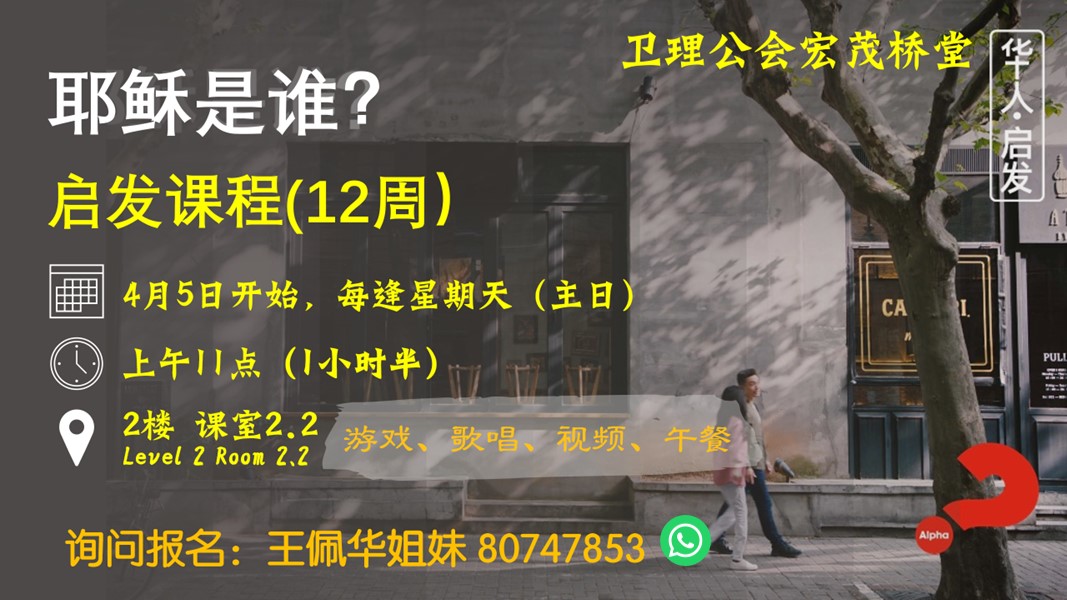 启发课程 5 April, 2026 – 28 June, 2026 11:00am-12.30pm 5楼Charis Hall 本堂将举办为期12周的《启发课程》。 如果您的家人、亲戚、朋友或同事还没认识主耶稣,或还没听过耶稣基督所带来的好消息,我们希望你能邀请他们来参加。
