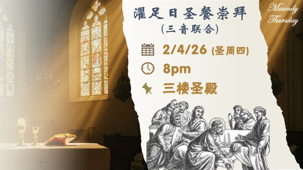 (濯足日)圣周四三音联合圣餐崇拜 2 April, 2026 8pm 一楼圣殿 Maundy Thursday Combined Holy Communion Service 在这一天我们纪念耶稣与门徒在阁楼上,在祂被逮捕钉十架前最后一次与门徒同处的一段时间。 濯足日有着三个别具意义的事件:1. 耶稣为祂的门徒洗脚2. 设立了主的圣餐和 3.提醒门徒彼此相爱的命令