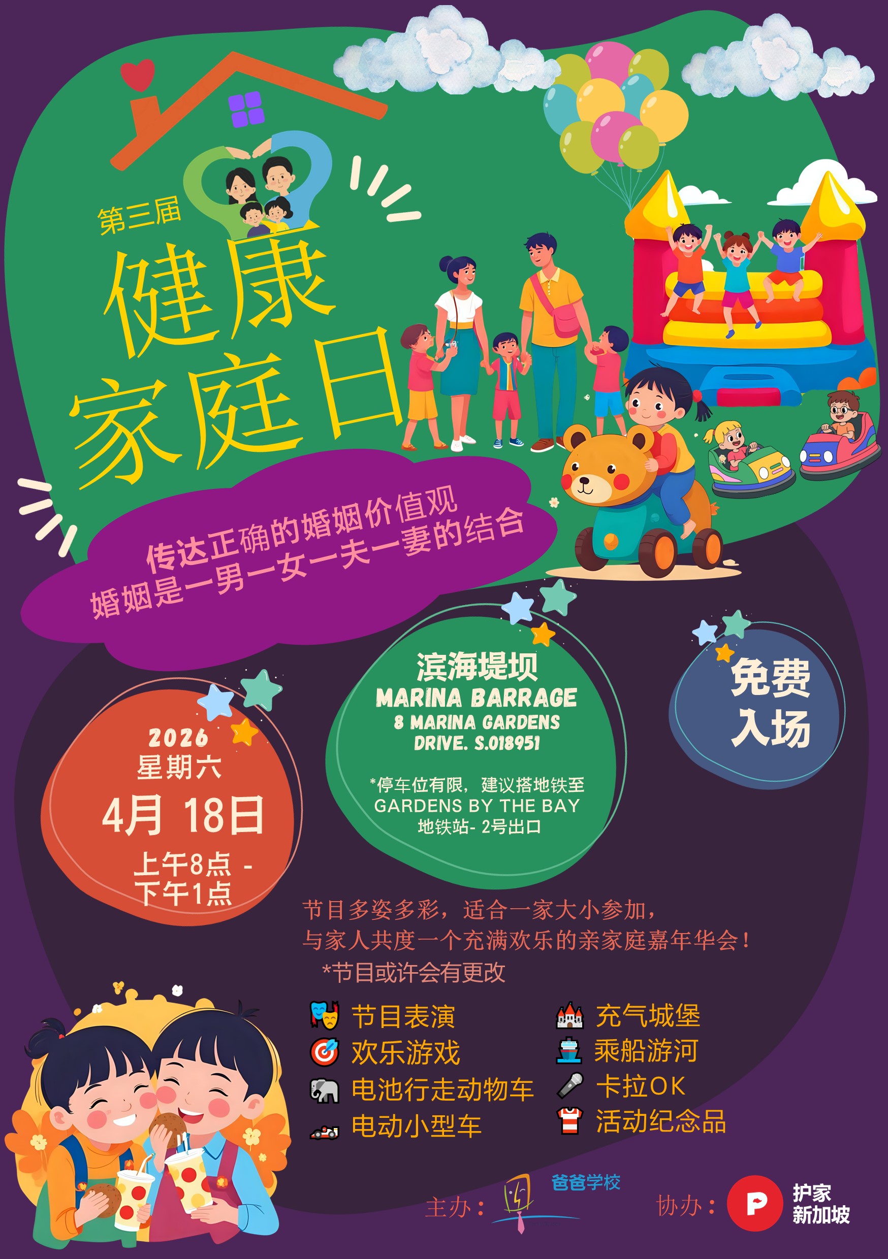 家庭事工-健康家庭日 18 April, 2026 8am Marina Barrage 在忙碌的生活中,家庭相聚的时刻格外珍贵。诚邀爸爸妈妈带着孩子一同参与「健康家庭日」,在轻松愉快的氛围中,一起学习、一起互动,共同传递正确的婚姻与家庭价值观。让孩子在爱与榜样中成长,也让家庭关系更加紧密。期待每一个家庭的参与,让爱与健康在家庭中延续。