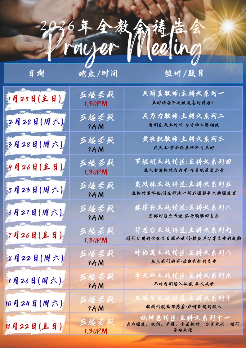 欢迎大家一起出席,彼此同心为着教会的事工一同代祷。