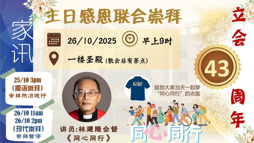 43周年主日感恩联合崇拜 26 October, 2025 9am 一楼圣殿 时光荏苒,今年本堂迎来了成立43周年。本堂也非常荣幸请到林建隆会督莅临并证道。 为了庆祝立会43周年,今年也会在25/10(周六),晚上7时30分特地安排了培灵会。若您想了解更多培灵会详情,请参阅 培灵会 。我们诚挚邀请您出席我们的42周年感恩联合崇拜。这是一个感恩与分享的时刻,期待与您共度。 也请留意: 26/10(主日)早上11时以及下午2时没有崇拜。请参加26/10主日早上9时联合崇拜。