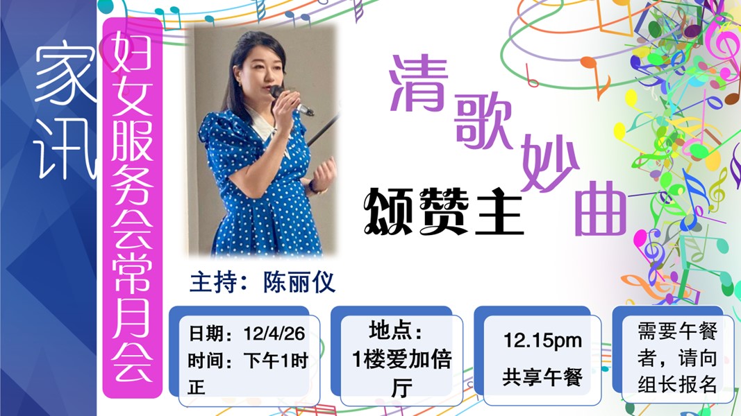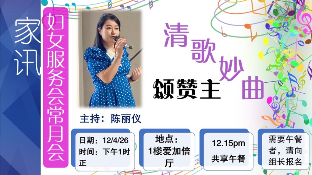 本堂妇女服务会固定在每个月的第二个星期,下午1时,在一楼爱家倍大厅有常月会。